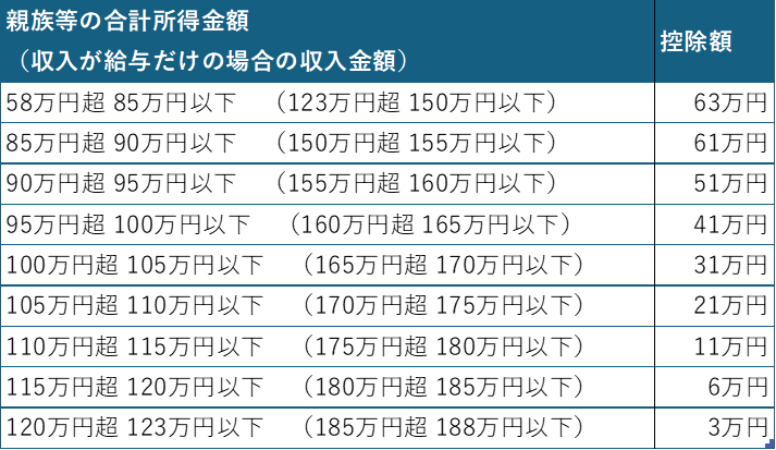 令和7年の年末調整から、特定親族の合計所得に応じて次の金額を控除することになります。